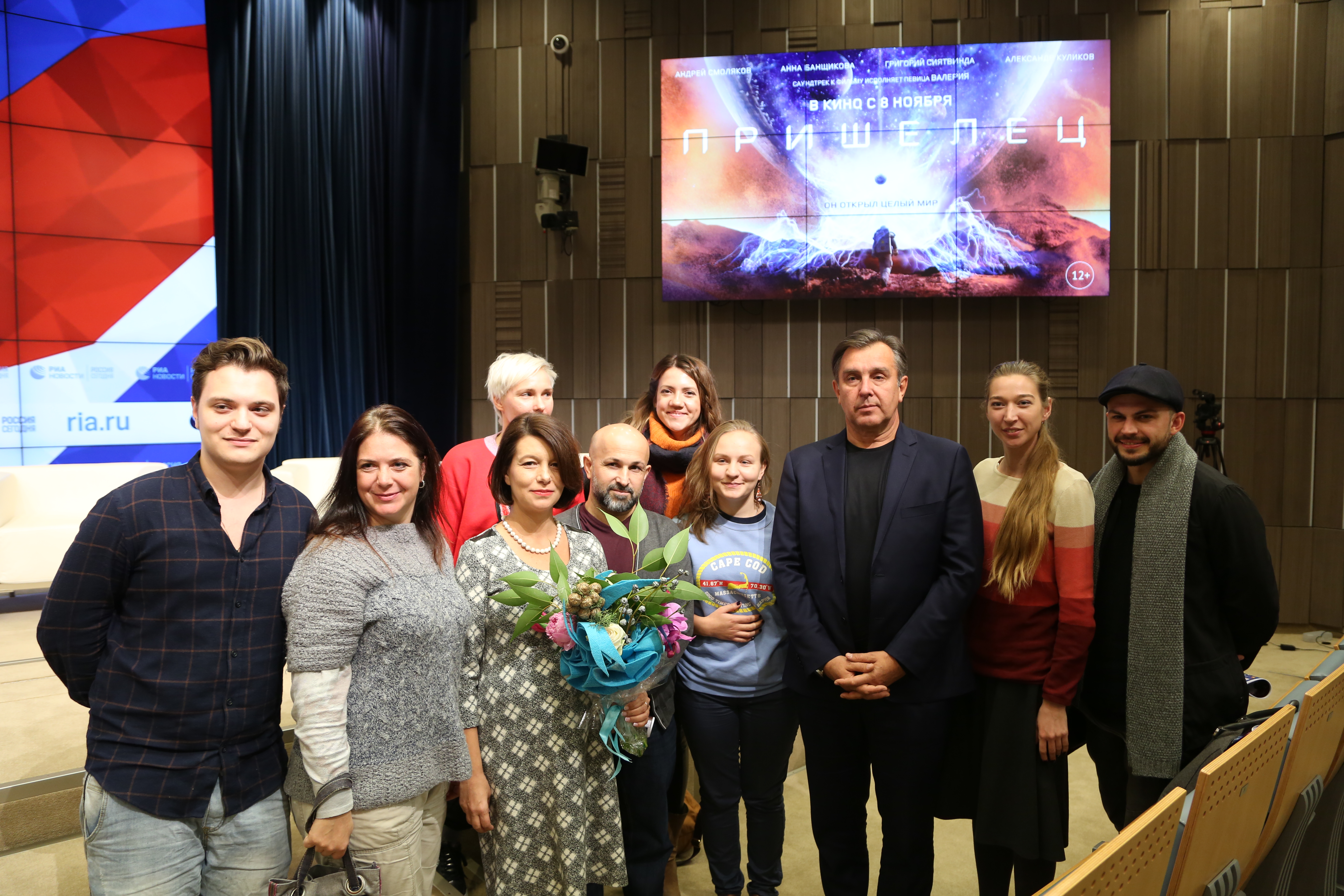 25 октября, в Международном мультимедийном пресс-центре МИА «Россия сегодня» прошел пресс-показ фильма «Пришелец», производства кинокомпании «Союз Маринс Групп», ставший одним из ожидаемых событий осени для журналистов. В большом зале пресс-центра собрались более 80 представителей федеральных и профильных СМИ. На пресс-конференции картину представили директор по связям с общественностью кинокомпании «Союз Маринс Групп», руководитель Киномедиацентра Павел Фокин, режиссер пост-продакшн Беата Соколова, креативный продюсер и соавтор сценария Александр Карпов, генеральный директор компании Люксор Дистрибьюшн Сергей Сорочкин, актеры - Алексей и Игорь Огурцовы, Анна Банщикова, Народная артистка России Валерия, исполнившая саундтрек к фильму, а также муж и продюсер певицы Иосиф Пригожин.